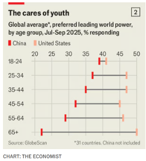 In a 2025 Economist poll conducted across 32 countries, preference for China as the leading global power (compared to the United States) correlated strongly with younger respondents, while older generations overwhelmingly favoured the US.